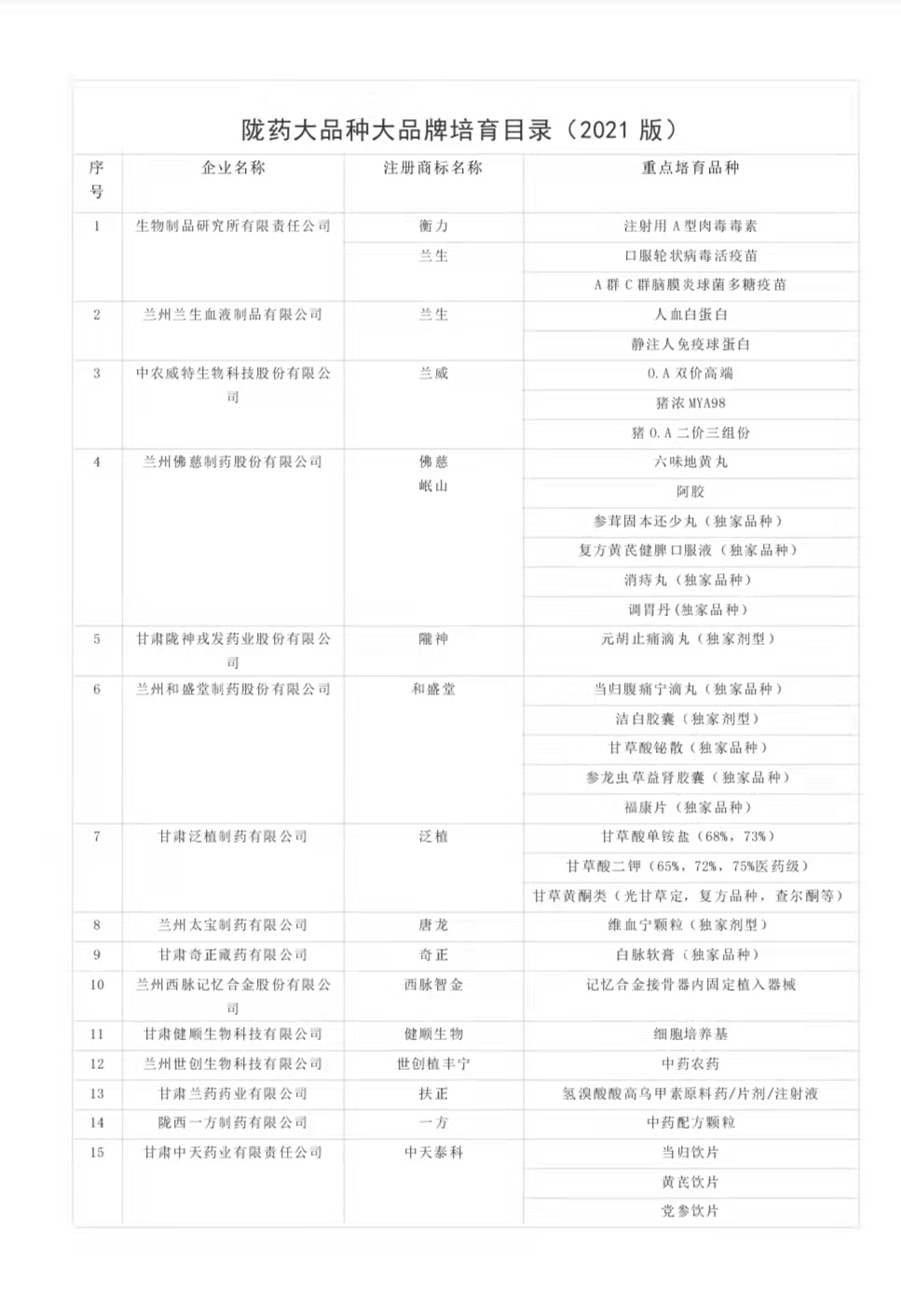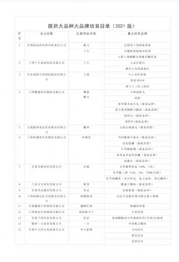 為切實抓好隴藥大品種大品牌培育工作,根據《甘肅省人民政府辦公廳關于支持隴藥大品種大品牌推動龍頭企業(yè)發(fā)展政策措施的通知》(甘政辦發(fā)〔2018〕131號)要求,經公示無異,現將隴藥大品種大品牌培育目錄(2021版)予以公告。