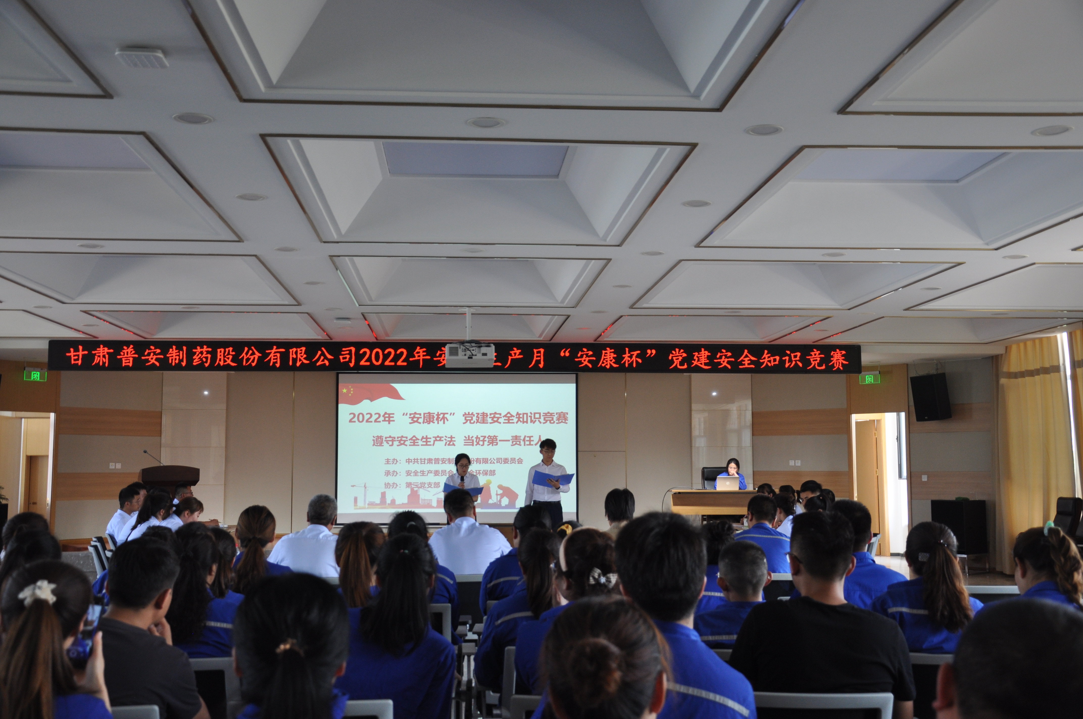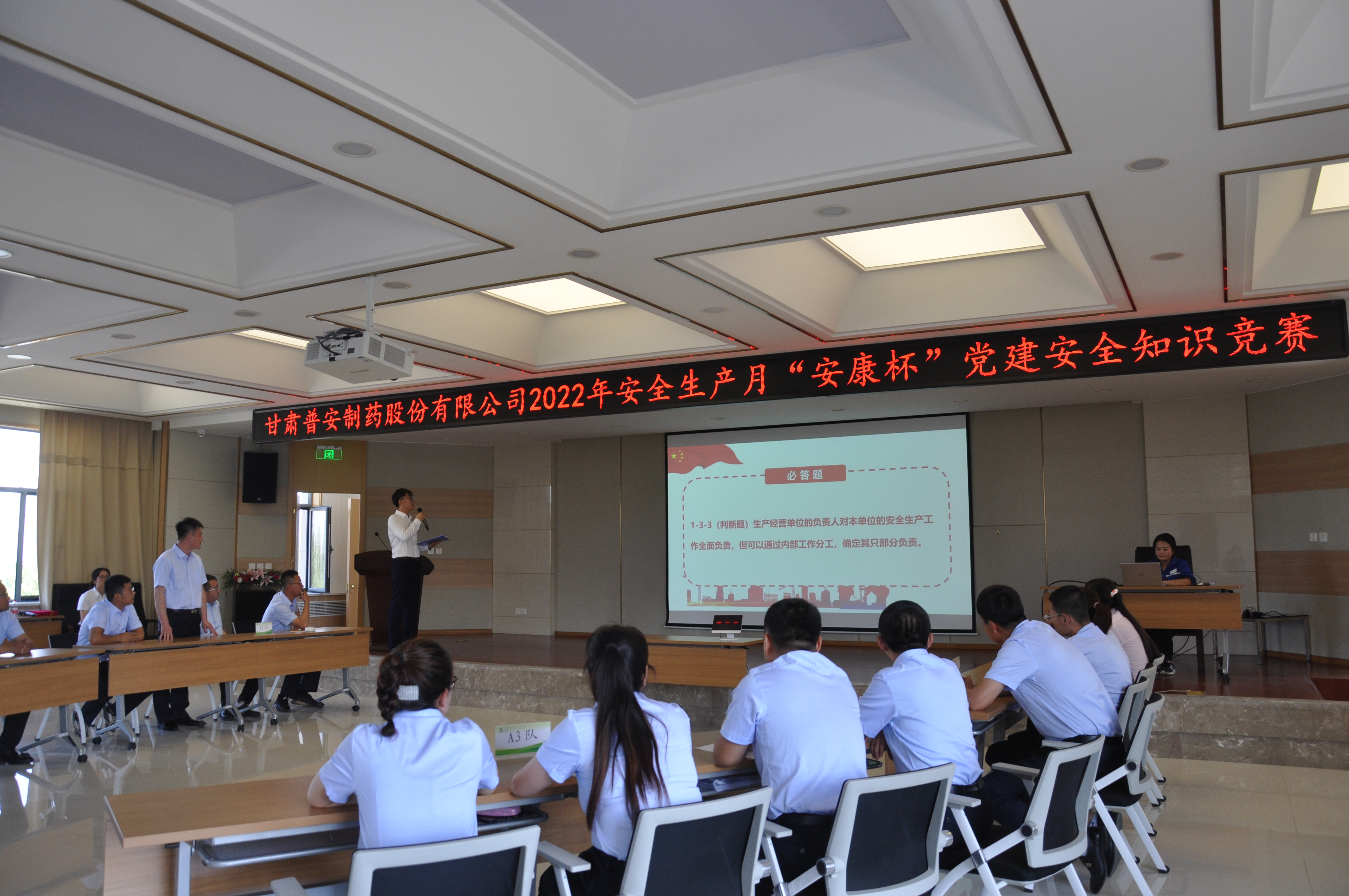 在七一建黨佳節到來之際,恰逢全國第21個安全生產月,甘肅普安制藥股份有限公司為認真落實習近平總書記關于安全生產的重要論述,宣傳貫徹《中華人民共和國安全生產法》,對照國務院安全生產十五條措施和省委省政府35條意見,進一步增強公司領導干部和職工安全防范意識,營造人人學安全、人人懂安全的氛圍,切實推動黨建促進安全生產工作落地見效。6月24日,公司黨委、安委會、第三黨支部聯合舉辦以“遵守安全生產法,當好第一責任人”為主題的“安康杯”黨建安全知識競賽