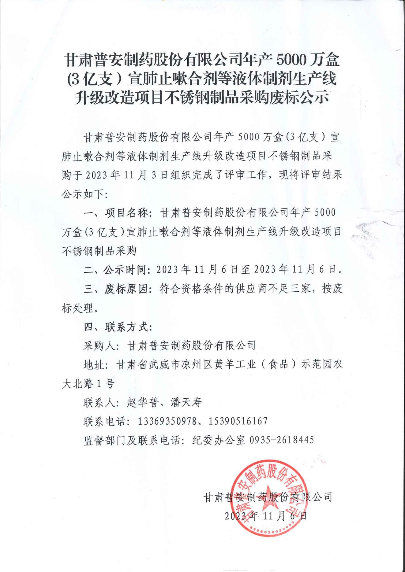 甘肅普安制藥股份有限公司年產5000萬盒(3億支)宣肺止嗽合劑等液體制劑生產線升級改造項目不銹鋼制品采購廢標公示