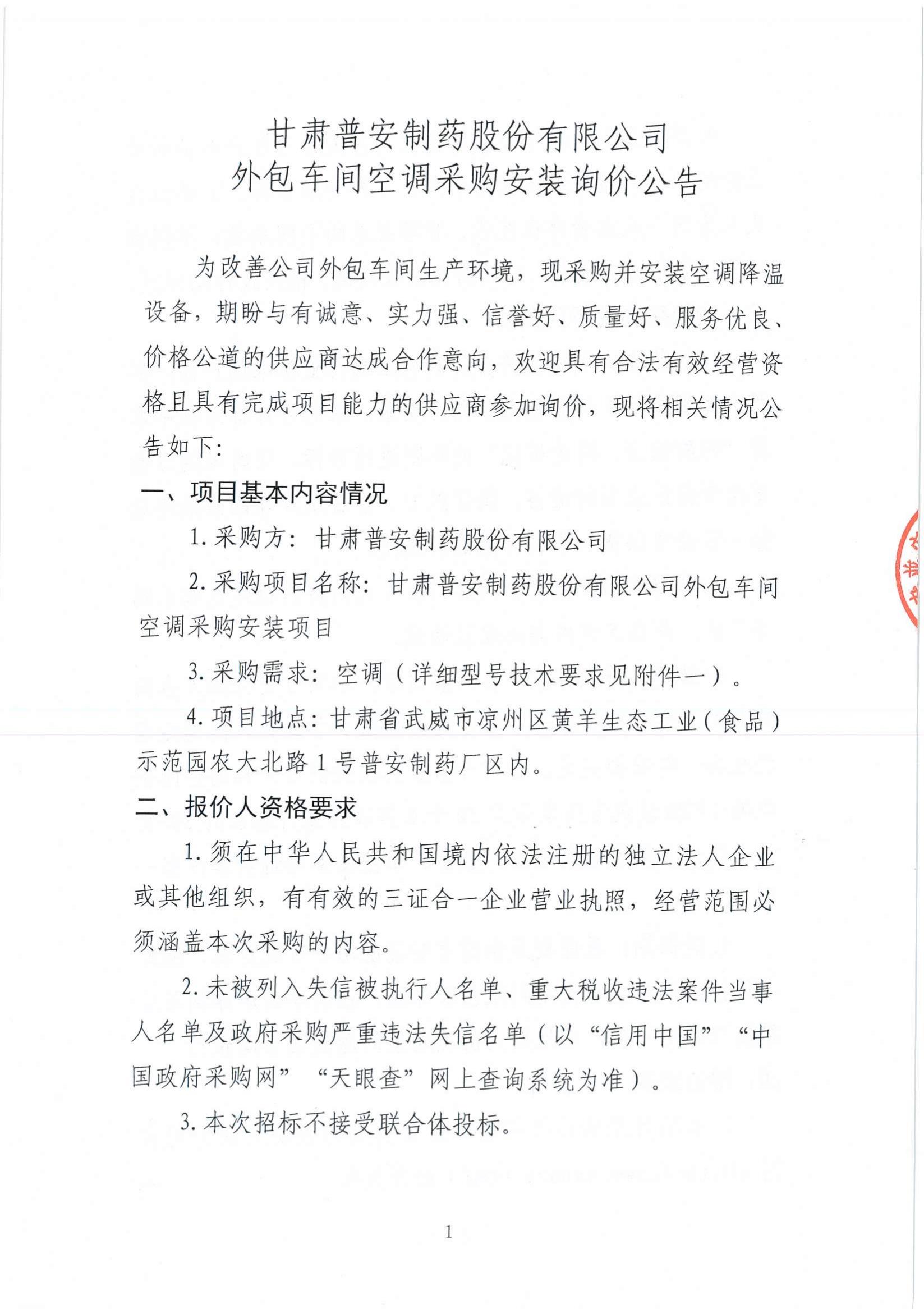 甘肅普安制藥股份有限公司外包車間空調采購安裝詢價公告