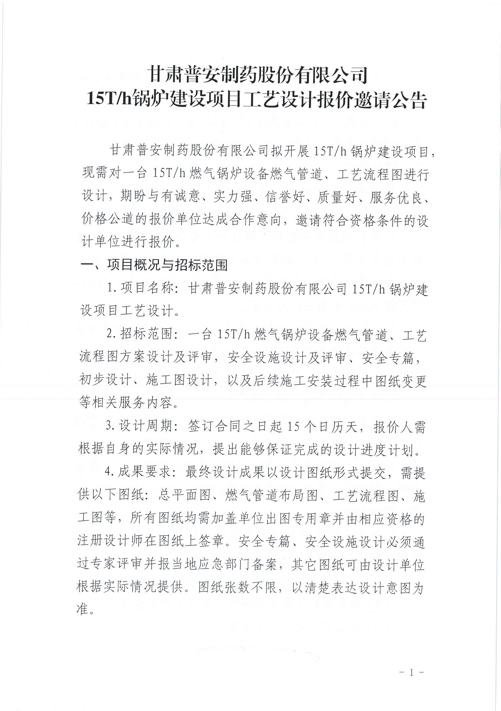 甘肅普安制藥股份有限公司15T/h鍋爐建設(shè)項(xiàng)目工藝設(shè)計(jì)報(bào)價(jià)邀請(qǐng)公告