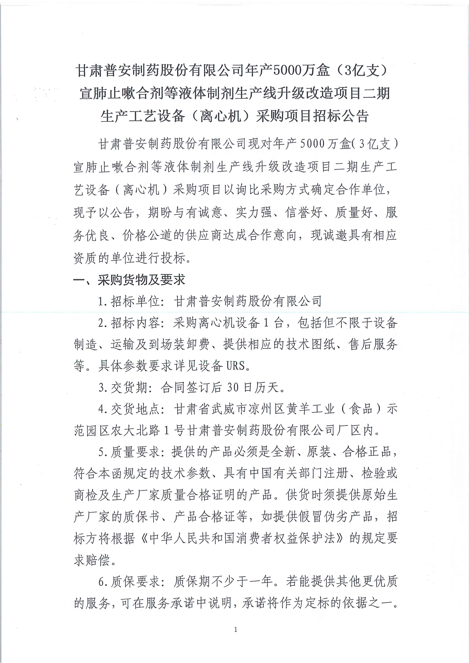 甘肅普安制藥股份有限公司年產(chǎn)5000萬(wàn)盒(3億支)宣肺止嗽合劑等液體制劑生產(chǎn)線升級(jí)改造項(xiàng)目二期生產(chǎn)工藝設(shè)備(離心機(jī))采購(gòu)項(xiàng)目招標(biāo)公告