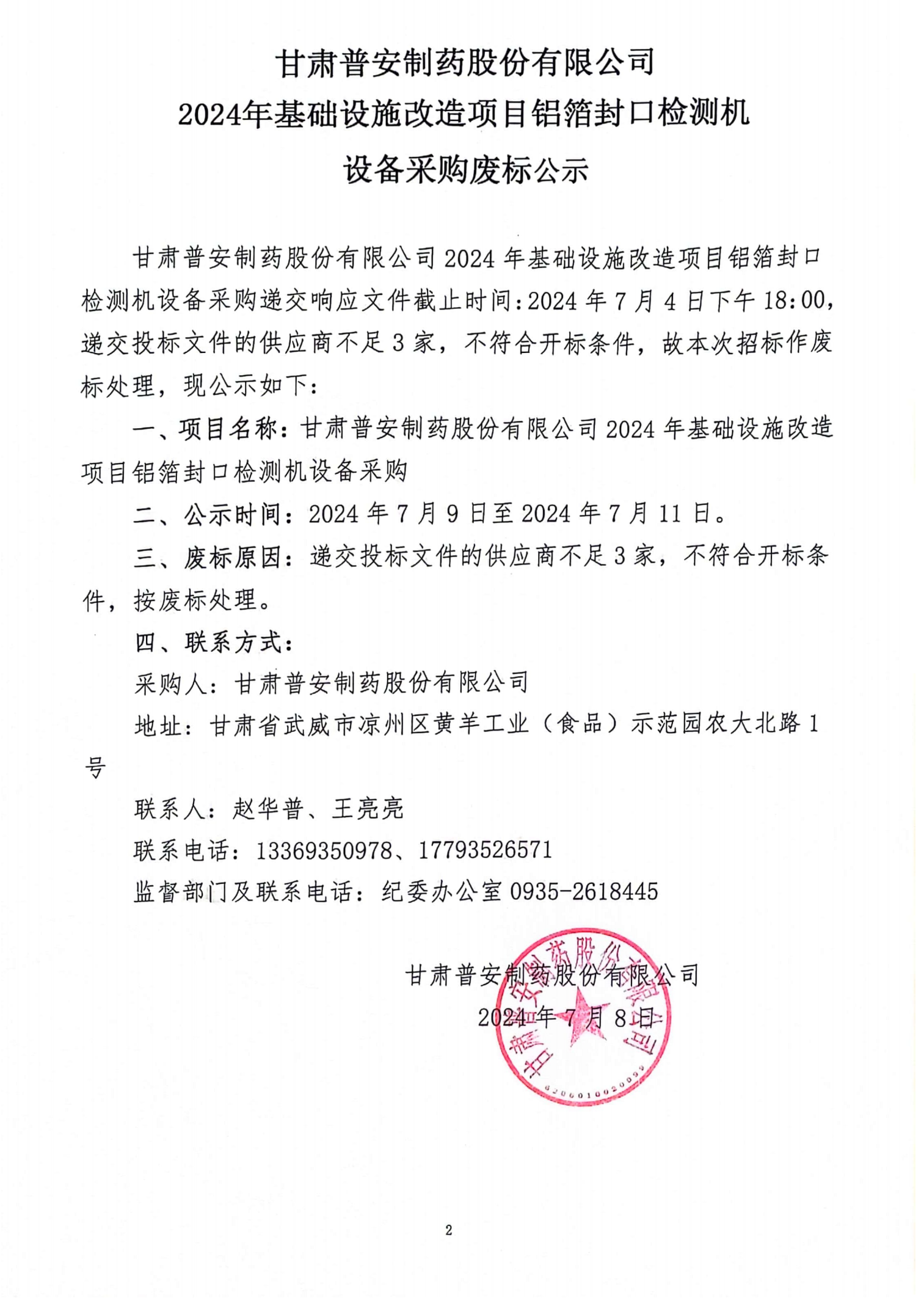 甘肅普安制藥股份有限公司2024年基礎設施改造項目鋁箔封口機設備采購廢標公示