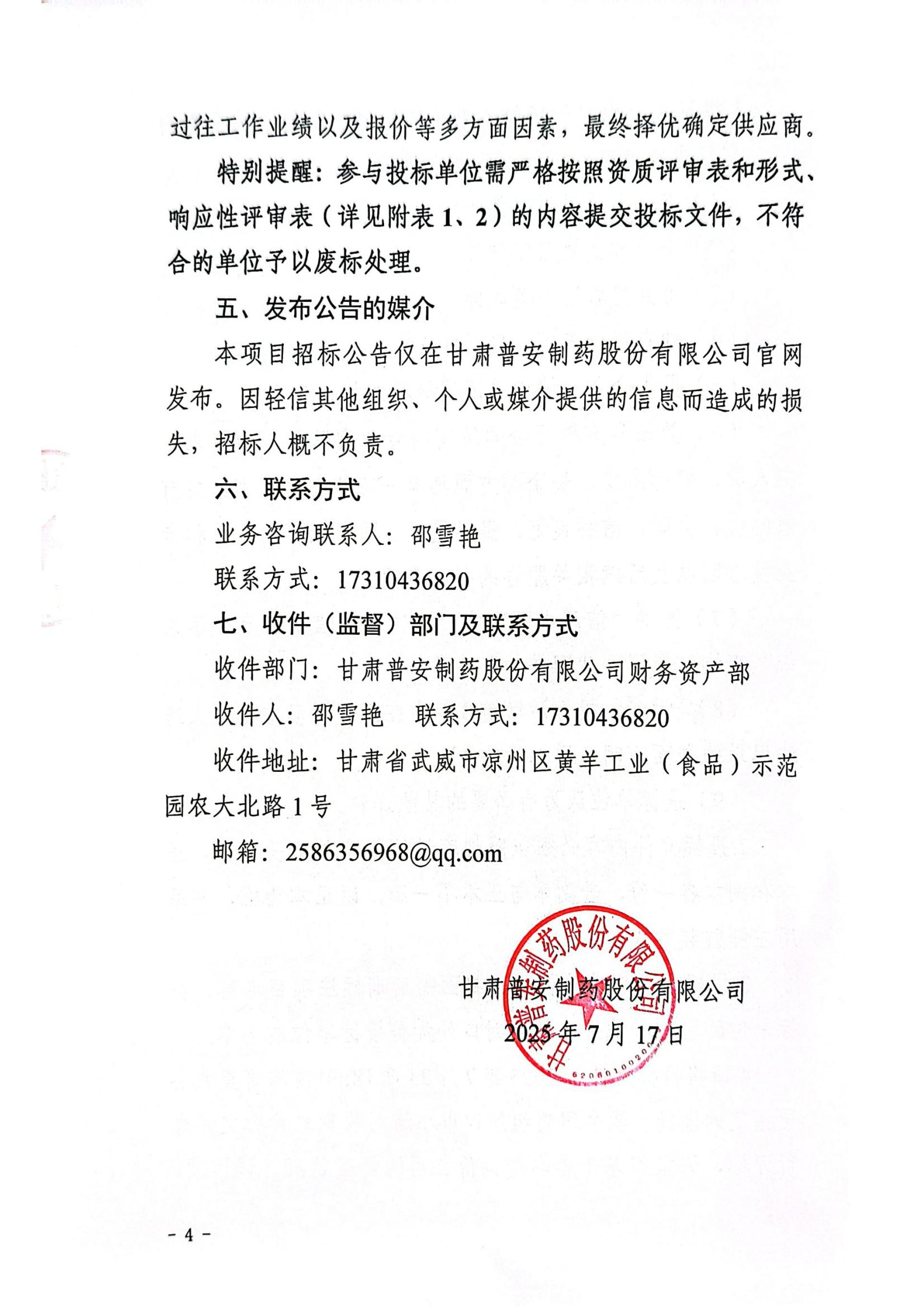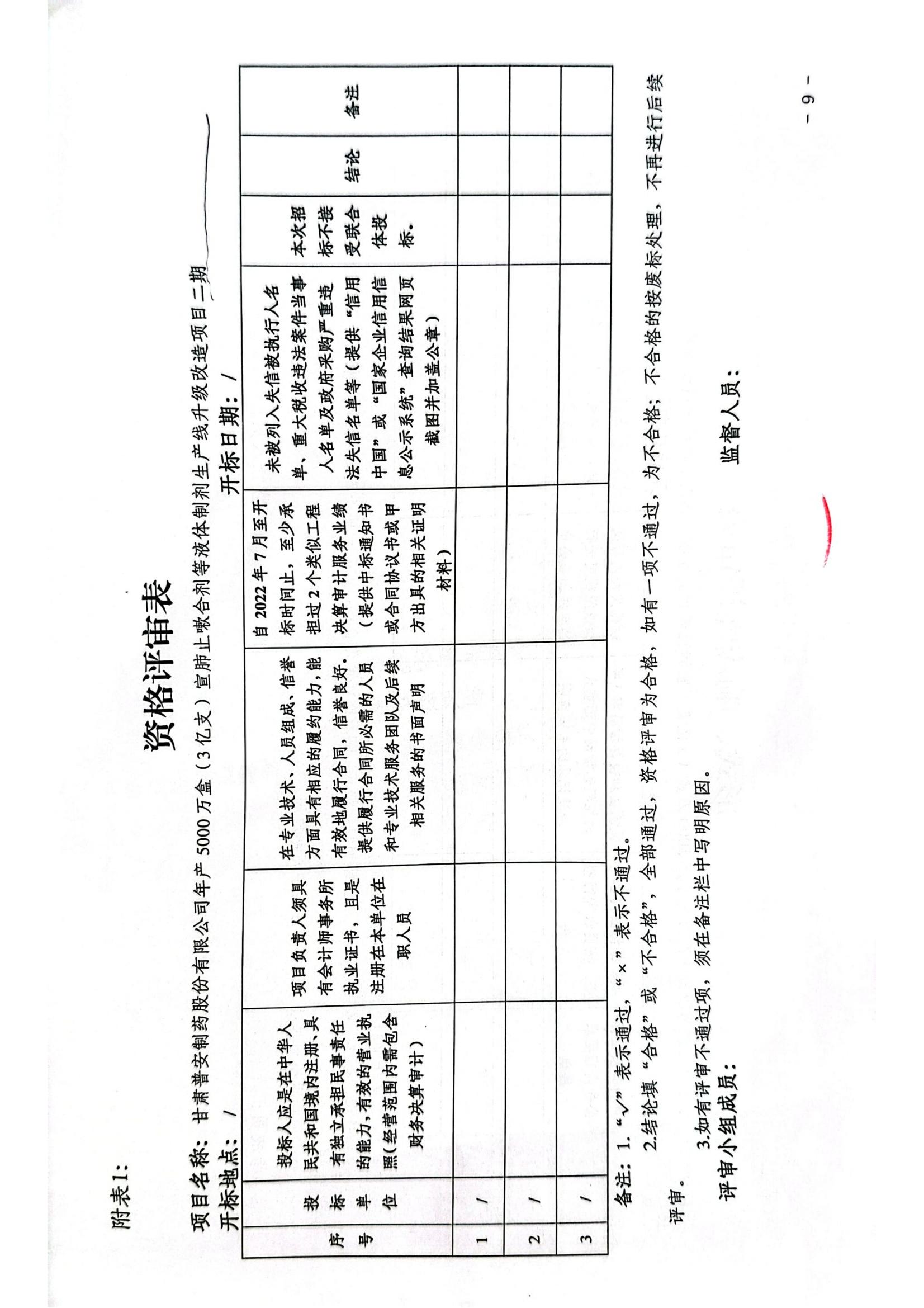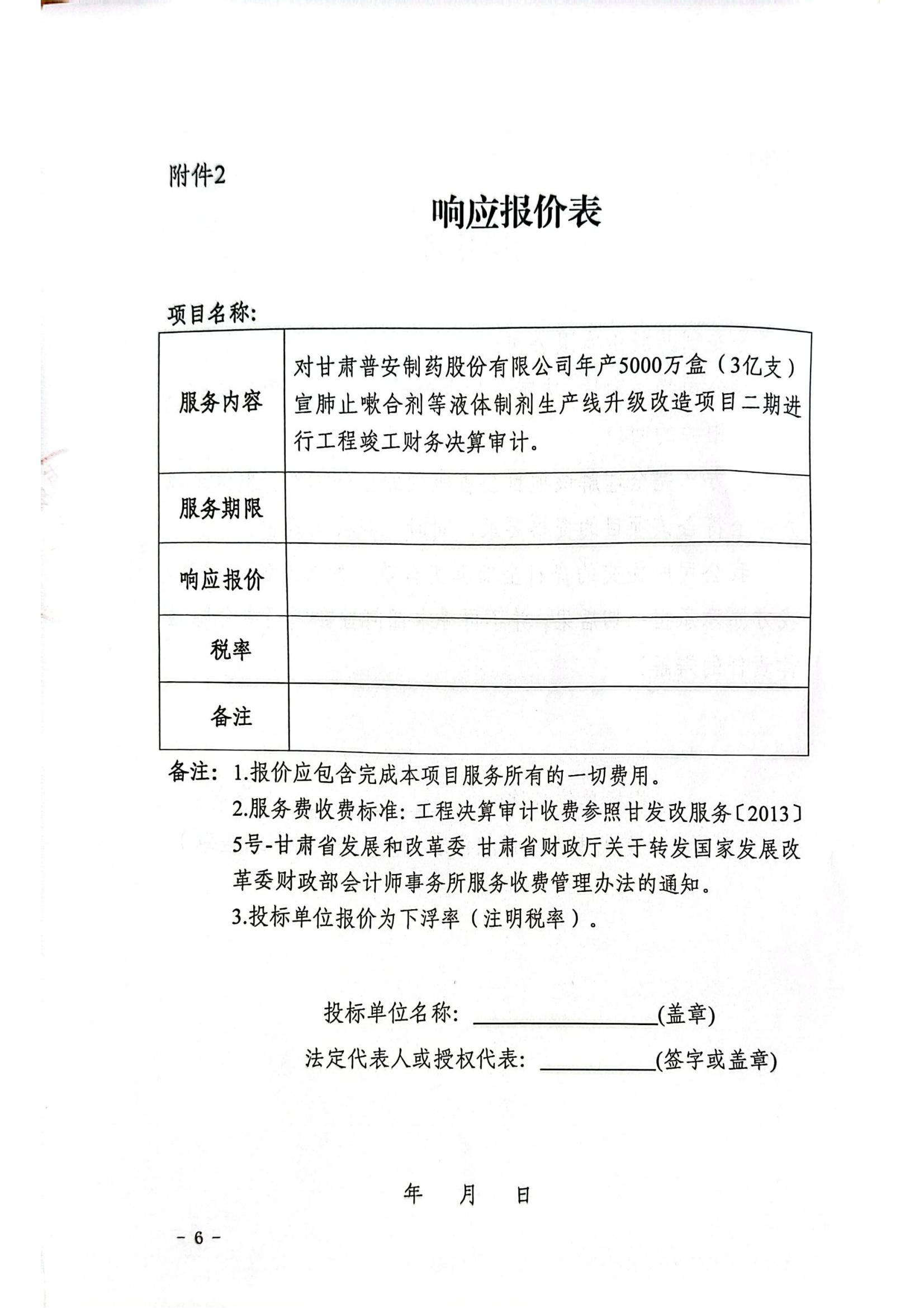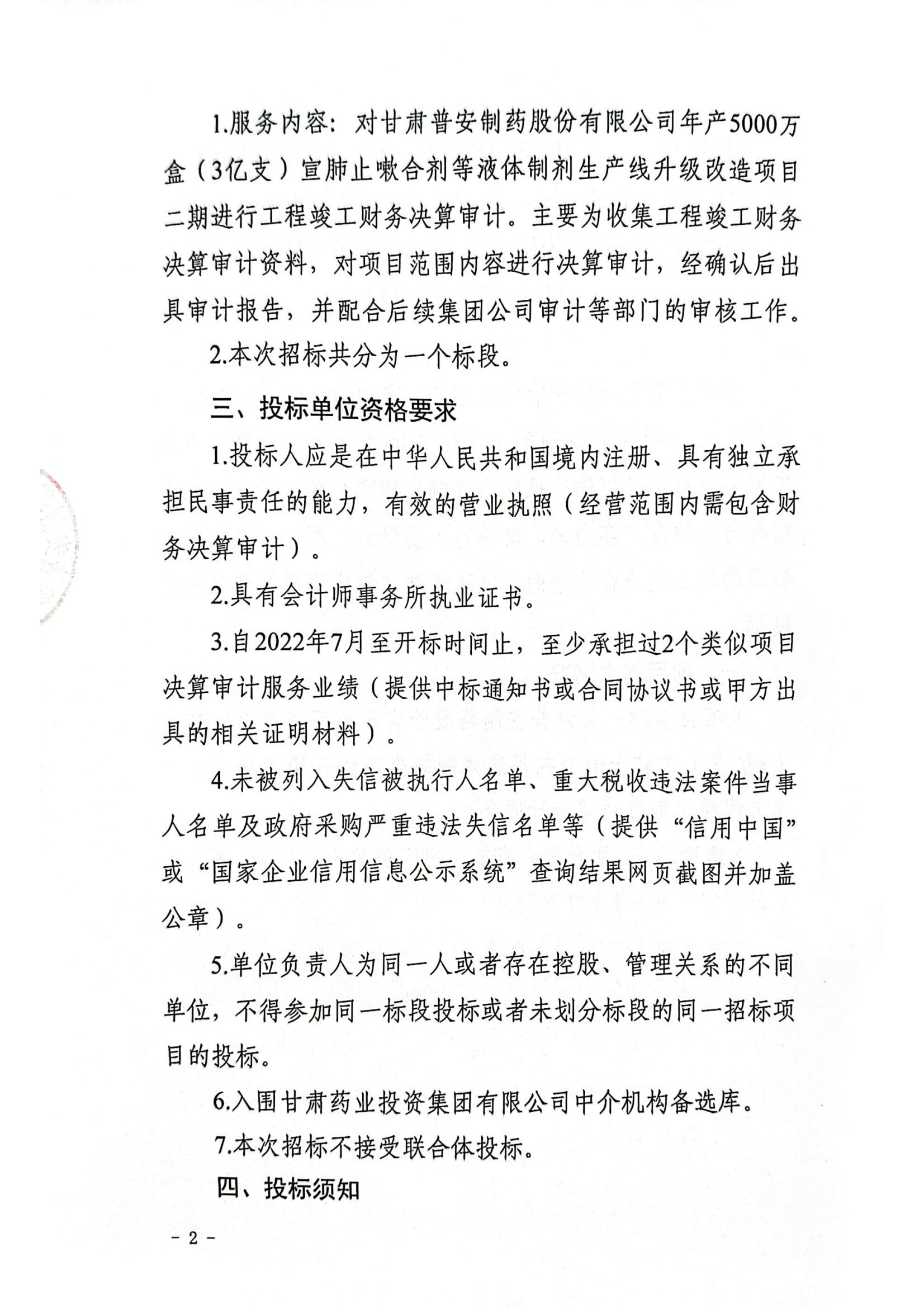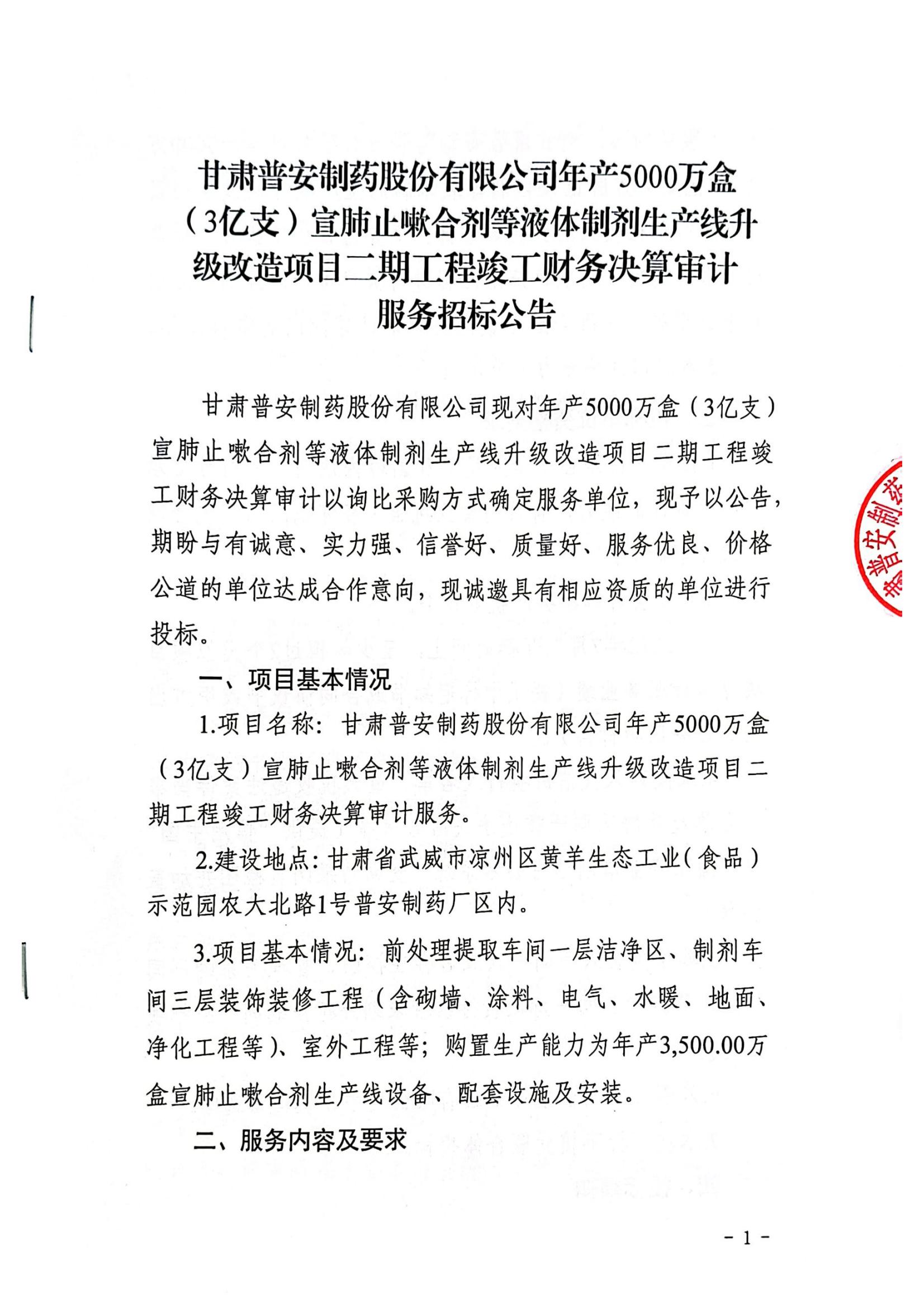 甘肅普安制藥股份有限公司年產(chǎn)5000萬盒宣肺止嗽合劑等液體制劑生產(chǎn)線升級改造項目二期竣工決算審計服務招標公告